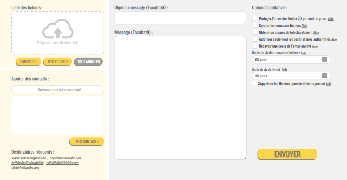 Avec dropCloud, vous pouvez envoyer très simplement et en nombre illimité tous types de fichiers qui n'auraient pas pu être envoyés via une boîte e-mail classique (jusqu'à 2 Go par fichier).